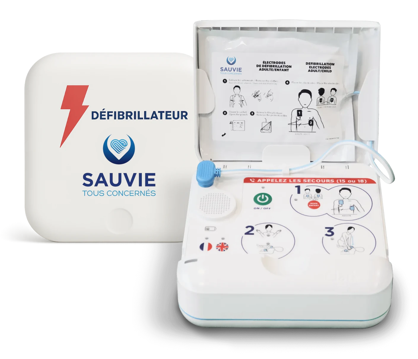 Le défibrillateur Sauvie est un modèle français, compact, connecté en 4G et entièrement automatique, conçu pour être utilisé par tous sans formation préalable. Il répond aux normes européennes et bénéficie d’une garantie jusqu’à 7 ans, avec maintenance et télésurveillance incluses.
